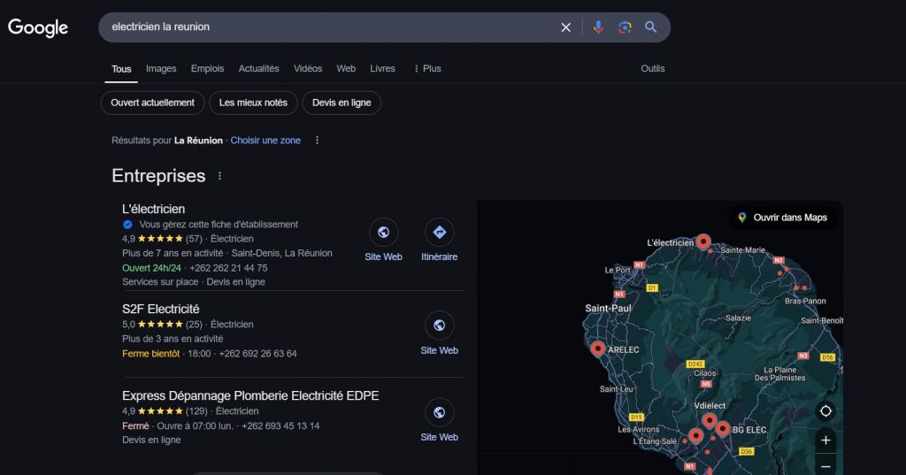 🎯 Conclusion : Grâce à la combinaison de ISYlocal (à partir de 15€ par mois, avec test gratuit de 3 mois) pour le référencement local, ISYsite WP (à partir de 699€ Ht le site) pour un site internet performant, une gestion rigoureuse de son e-réputation, et une présence active sur les réseaux sociaux, L’Électricien Réunion est aujourd’hui leader sur Google, attirant un maximum de clients et consolidant sa notoriété.